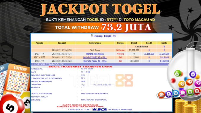 TOGEL88 JACKPOT TOGEL di TOTOMACAU 4D Rp 73.200.000,- LUNAS