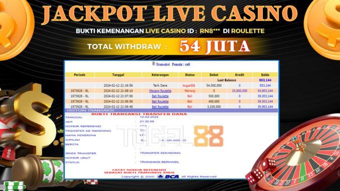 TOGEL88 JACKPOT LIVE CASINO DI ROULETTE Rp 54.000.000,- LUNAS