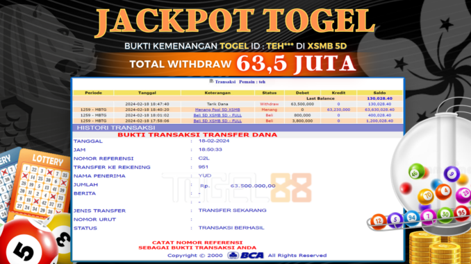 TOGEL88 JACKPOT TOGEL DI XSMB Rp 63.500.000,- LUNAS