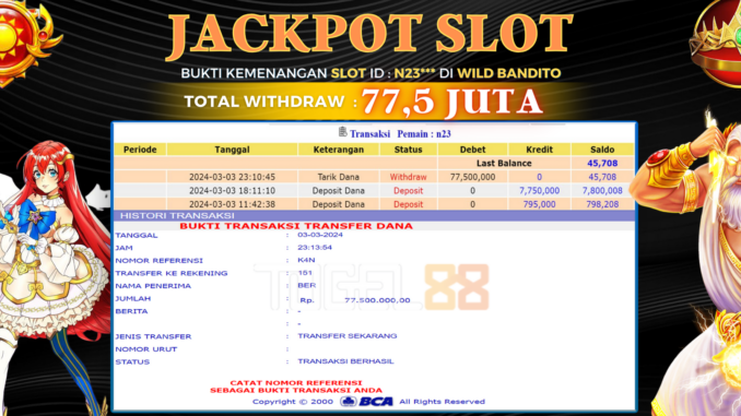 TOGEL88 JACKPOT SLOT DI WILD BANDITO Rp 77.500.000,- LUNAS