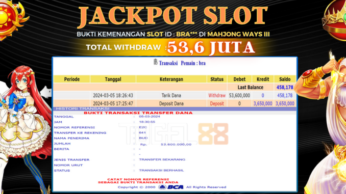 TOGEL88 mengucapkan selamat kepada user id : BRA*** yang telah berhasil mendapatkan jackpot pada permainan SLOT DI MAHJONG WAYS III. Kemenangan sebesar Rp 53.600.000,-. telah dibayarkan LUNAS oleh pihak TOGEL88 kepada pemilik user id setelah yang bersangkutan mengisi formulir withdraw. Proses pencairan dana berlangsung sangat cepat hanya dalam waktu 5-10 menit sudah berada dalam rekening pemilik user id. Bukti transfer yang dapat anda lihat adalah bukti SAH / VALID yang langsung di dapatkan melalui bukti transaksi dari Bank yang digunakan untuk pengiriman dana pada rekening pemilik user id. Terima kasih kami sampaikan kepada para pengguna setia TOGEL88 yang telah menggunakan situs kami, sebagai Bandar Terpercaya yang pastinya membayar semua kemenangan member hingga lunas. Apakah TOGEL88 PENIPU ? Reputasi “TOGEL88 TERPERCAYA” sudah sangat melekat. puluhan hingga ratusan ribu pengguna setia TOGEL88 tetap menggunakan situs terbesar dan terbaik di Indonesia ini. Hapus rasa was-was dan khawatir anda, kemenangan anda berapapun PASTI dibayarkan hingga lunas.