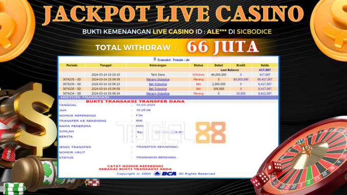 MEMBER TOGEL88 MENERIMA PELUNASAN KEMENANGAN JACKPOT LIVE CASINO DI SICBODICE Rp 66.000.000,- LUNAS