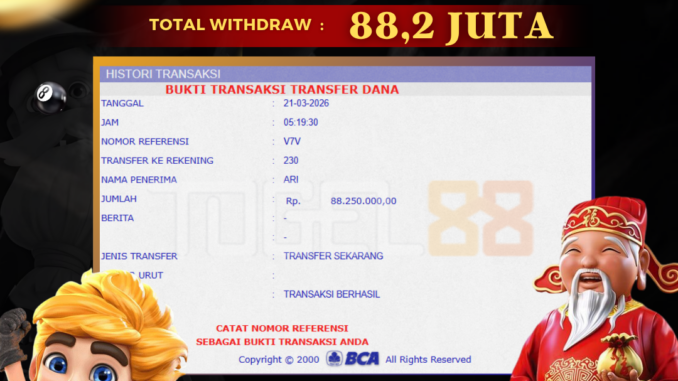TOGEL88 mengucapkan selamat kepada user id : SAS*** yang telah berhasil mendapatkan jackpot pada permainan SLOT DI HOT HOT FRUIT. Kemenangan sebesar Rp 88.200.000,-. telah dibayarkan LUNAS oleh pihak TOGEL88 kepada pemilik user id setelah yang bersangkutan mengisi formulir withdraw. Proses pencairan dana berlangsung sangat cepat hanya dalam waktu 5-10 menit sudah berada dalam rekening pemilik user id. Bukti transfer yang dapat anda lihat adalah bukti SAH / VALID yang langsung di dapatkan melalui bukti transaksi dari Bank yang digunakan untuk pengiriman dana pada rekening pemilik user id. Terima kasih kami sampaikan kepada para pengguna setia TOGEL88 yang telah menggunakan situs kami, sebagai Bandar Terpercaya yang pastinya membayar semua kemenangan member hingga lunas. Apakah TOGEL88 PENIPU ? Reputasi “TOGEL88 TERPERCAYA” sudah sangat melekat. puluhan hingga ratusan ribu pengguna setia TOGEL88 tetap menggunakan situs terbesar dan terbaik di Indonesia ini. Hapus rasa was-was dan khawatir anda, kemenangan anda berapapun PASTI dibayarkan hingga lunas.