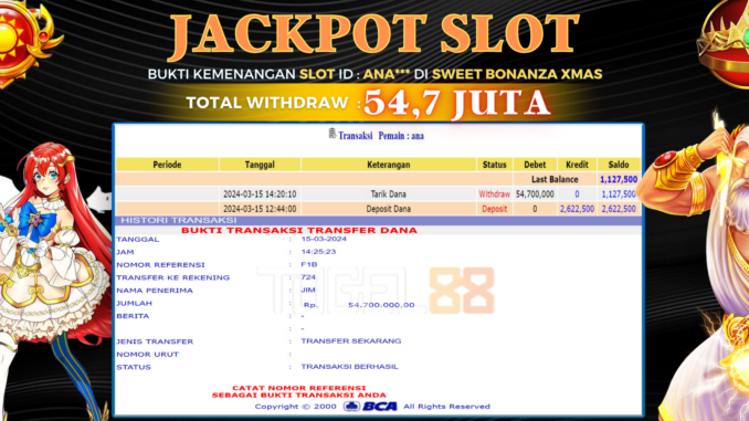 TOGEL88 mengucapkan selamat kepada user id : ANA*** yang telah berhasil mendapatkan jackpot pada permainan SLOT DI SLOT SWEET BONANZA XMAS. Kemenangan sebesar Rp 54.700.000,-. telah dibayarkan LUNAS oleh pihak TOGEL88 kepada pemilik user id setelah yang bersangkutan mengisi formulir withdraw. Proses pencairan dana berlangsung sangat cepat hanya dalam waktu 5-10 menit sudah berada dalam rekening pemilik user id. Bukti transfer yang dapat anda lihat adalah bukti SAH / VALID yang langsung di dapatkan melalui bukti transaksi dari Bank yang digunakan untuk pengiriman dana pada rekening pemilik user id. Terima kasih kami sampaikan kepada para pengguna setia TOGEL88 yang telah menggunakan situs kami, sebagai Bandar Terpercaya yang pastinya membayar semua kemenangan member hingga lunas. Apakah TOGEL88 PENIPU ? Reputasi “TOGEL88 TERPERCAYA” sudah sangat melekat. puluhan hingga ratusan ribu pengguna setia TOGEL88 tetap menggunakan situs terbesar dan terbaik di Indonesia ini. Hapus rasa was-was dan khawatir anda, kemenangan anda berapapun PASTI dibayarkan hingga lunas.