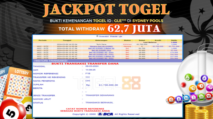 TOGEL88 JACKPOT TOGEL DI SYDNEY POOLS Rp 62.700.000,- LUNAS