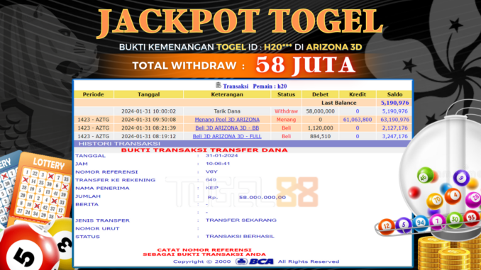 TOGEL88 JACKPOT TOGEL DI ARIZONA 3D Rp 58.000.000,- LUNAS