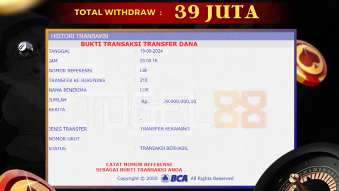 TOGEL88 mengucapkan selamat kepada user id : LUK*** yang telah berhasil mendapatkan jackpot pada permainan LIVE CASINO di FANTAN. Kemenangan sebesar Rp 39.000.000,-. telah dibayarkan LUNAS oleh pihak TOGEL88 kepada pemilik user id setelah yang bersangkutan mengisi formulir withdraw. Proses pencairan dana berlangsung sangat cepat hanya dalam waktu 5-10 menit sudah berada dalam rekening pemilik user id. Bukti transfer yang dapat anda lihat adalah bukti SAH / VALID yang langsung di dapatkan melalui bukti transaksi dari Bank yang digunakan untuk pengiriman dana pada rekening pemilik user id. Terima kasih kami sampaikan kepada para pengguna setia TOGEL88 yang telah menggunakan situs kami, sebagai Bandar Terpercaya yang pastinya membayar semua kemenangan member hingga lunas. Apakah TOGEL88 PENIPU ? Reputasi “TOGEL88 TERPERCAYA” sudah sangat melekat. puluhan hingga ratusan ribu pengguna setia TOGEL88 tetap menggunakan situs terbesar dan terbaik di Indonesia ini. Hapus rasa was-was dan khawatir anda, kemenangan anda berapapun PASTI dibayarkan hingga lunas.