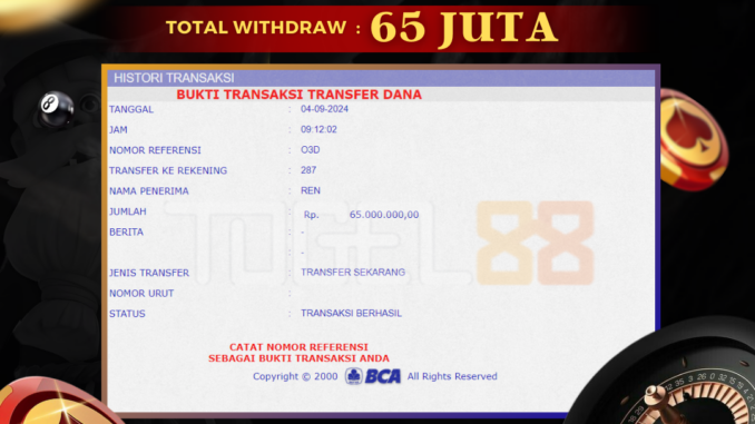 TOGEL88 mengucapkan selamat kepada user id : REN*** yang telah berhasil mendapatkan jackpot pada permainan CASINO DI DICE 6 . Kemenangan sebesar Rp 65.000.000,-. telah dibayarkan LUNAS oleh pihak TOGEL88 kepada pemilik user id setelah yang bersangkutan mengisi formulir withdraw. Proses pencairan dana berlangsung sangat cepat hanya dalam waktu 5-10 menit sudah berada dalam rekening pemilik user id. Bukti transfer yang dapat anda lihat adalah bukti SAH / VALID yang langsung di dapatkan melalui bukti transaksi dari Bank yang digunakan untuk pengiriman dana pada rekening pemilik user id. Terima kasih kami sampaikan kepada para pengguna setia TOGEL88 yang telah menggunakan situs kami, sebagai Bandar Terpercaya yang pastinya membayar semua kemenangan member hingga lunas. Apakah TOGEL88 PENIPU ? Reputasi “TOGEL88 TERPERCAYA” sudah sangat melekat. puluhan hingga ratusan ribu pengguna setia TOGEL88 tetap menggunakan situs terbesar dan terbaik di Indonesia ini. Hapus rasa was-was dan khawatir anda, kemenangan anda berapapun PASTI dibayarkan hingga lunas.