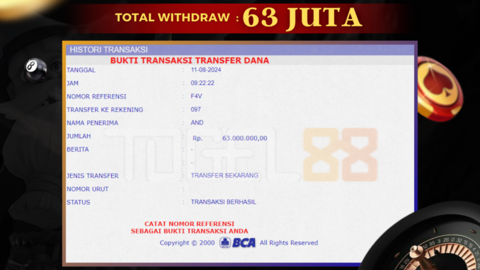 TOGEL88 mengucapkan selamat kepada user id : FEX*** yang telah berhasil mendapatkan jackpot pada permainan LIVE CASINO DI SHIO FIGHT. Kemenangan sebesar Rp 63.000.000,-. telah dibayarkan LUNAS oleh pihak TOGEL88 kepada pemilik user id setelah yang bersangkutan mengisi formulir withdraw. Proses pencairan dana berlangsung sangat cepat hanya dalam waktu 5-10 menit sudah berada dalam rekening pemilik user id. Bukti transfer yang dapat anda lihat adalah bukti SAH / VALID yang langsung di dapatkan melalui bukti transaksi dari Bank yang digunakan untuk pengiriman dana pada rekening pemilik user id. Terima kasih kami sampaikan kepada para pengguna setia TOGEL88 yang telah menggunakan situs kami, sebagai Bandar Terpercaya yang pastinya membayar semua kemenangan member hingga lunas. Apakah TOGEL88 PENIPU ? Reputasi “TOGEL88 TERPERCAYA” sudah sangat melekat. puluhan hingga ratusan ribu pengguna setia TOGEL88 tetap menggunakan situs terbesar dan terbaik di Indonesia ini. Hapus rasa was-was dan khawatir anda, kemenangan anda berapapun PASTI dibayarkan hingga lunas.