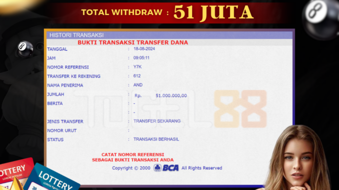 TOGEL88 mengucapkan selamat kepada user id : AND*** yang telah berhasil mendapatkan jackpot pada permainan TOGEL DI 4D JOWOPOOLS. Kemenangan sebesar Rp 51.000.000,-. telah dibayarkan LUNAS oleh pihak TOGEL88 kepada pemilik user id setelah yang bersangkutan mengisi formulir withdraw. Proses pencairan dana berlangsung sangat cepat hanya dalam waktu 5-10 menit sudah berada dalam rekening pemilik user id. Bukti transfer yang dapat anda lihat adalah bukti SAH / VALID yang langsung di dapatkan melalui bukti transaksi dari Bank yang digunakan untuk pengiriman dana pada rekening pemilik user id. Terima kasih kami sampaikan kepada para pengguna setia TOGEL88 yang telah menggunakan situs kami, sebagai Bandar Terpercaya yang pastinya membayar semua kemenangan member hingga lunas. Apakah TOGEL88 PENIPU ? Reputasi “TOGEL88 TERPERCAYA” sudah sangat melekat. puluhan hingga ratusan ribu pengguna setia TOGEL88 tetap menggunakan situs terbesar dan terbaik di Indonesia ini. Hapus rasa was-was dan khawatir anda, kemenangan anda berapapun PASTI dibayarkan hingga lunas.