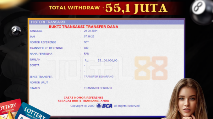 TOGEL88 mengucapkan selamat kepada user id : F4N*** yang telah berhasil mendapatkan jackpot pada permainan TOGEL di WASHINGTON DC 4D. Kemenangan sebesar Rp 55.100.000,-. telah dibayarkan LUNAS oleh pihak TOGEL88 kepada pemilik user id setelah yang bersangkutan mengisi formulir withdraw. Proses pencairan dana berlangsung sangat cepat hanya dalam waktu 5-10 menit sudah berada dalam rekening pemilik user id. Bukti transfer yang dapat anda lihat adalah bukti SAH / VALID yang langsung di dapatkan melalui bukti transaksi dari Bank yang digunakan untuk pengiriman dana pada rekening pemilik user id. Terima kasih kami sampaikan kepada para pengguna setia TOGEL88 yang telah menggunakan situs kami, sebagai Bandar Terpercaya yang pastinya membayar semua kemenangan member hingga lunas. Apakah TOGEL88 PENIPU ? Reputasi “TOGEL88 TERPERCAYA” sudah sangat melekat. puluhan hingga ratusan ribu pengguna setia TOGEL88 tetap menggunakan situs terbesar dan terbaik di Indonesia ini. Hapus rasa was-was dan khawatir anda, kemenangan anda berapapun PASTI dibayarkan hingga lunas.
