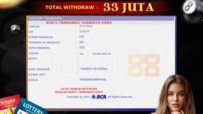 TOGEL88 mengucapkan selamat kepada user id : DEO*** yang telah berhasil mendapatkan jackpot pada permainan TOGEL DI TOTO MACAU 4D. Kemenangan sebesar Rp 33.000.000,-. telah dibayarkan LUNAS oleh pihak TOGEL88 kepada pemilik user id setelah yang bersangkutan mengisi formulir withdraw. Proses pencairan dana berlangsung sangat cepat hanya dalam waktu 5-10 menit sudah berada dalam rekening pemilik user id. Bukti transfer yang dapat anda lihat adalah bukti SAH / VALID yang langsung di dapatkan melalui bukti transaksi dari Bank yang digunakan untuk pengiriman dana pada rekening pemilik user id. Terima kasih kami sampaikan kepada para pengguna setia TOGEL88 yang telah menggunakan situs kami, sebagai Bandar Terpercaya yang pastinya membayar semua kemenangan member hingga lunas. Apakah TOGEL88 PENIPU ? Reputasi “TOGEL88 TERPERCAYA” sudah sangat melekat. puluhan hingga ratusan ribu pengguna setia TOGEL88 tetap menggunakan situs terbesar dan terbaik di Indonesia ini. Hapus rasa was-was dan khawatir anda, kemenangan anda berapapun PASTI dibayarkan hingga lunas.