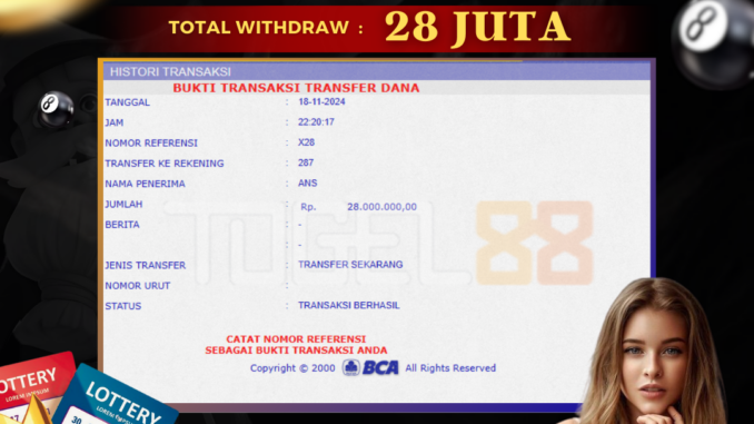 TOGEL88 mengucapkan selamat kepada user id : ANS*** yang telah berhasil mendapatkan jackpot pada permainan TOGEL DI JAKARTA 5D. Kemenangan sebesar Rp 28.000.000,-. telah dibayarkan LUNAS oleh pihak TOGEL88 kepada pemilik user id setelah yang bersangkutan mengisi formulir withdraw. Proses pencairan dana berlangsung sangat cepat hanya dalam waktu 5-10 menit sudah berada dalam rekening pemilik user id. Bukti transfer yang dapat anda lihat adalah bukti SAH / VALID yang langsung di dapatkan melalui bukti transaksi dari Bank yang digunakan untuk pengiriman dana pada rekening pemilik user id. Terima kasih kami sampaikan kepada para pengguna setia TOGEL88 yang telah menggunakan situs kami, sebagai Bandar Terpercaya yang pastinya membayar semua kemenangan member hingga lunas. Apakah TOGEL88 PENIPU ? Reputasi “TOGEL88 TERPERCAYA” sudah sangat melekat. puluhan hingga ratusan ribu pengguna setia TOGEL88 tetap menggunakan situs terbesar dan terbaik di Indonesia ini. Hapus rasa was-was dan khawatir anda, kemenangan anda berapapun PASTI dibayarkan hingga lunas.