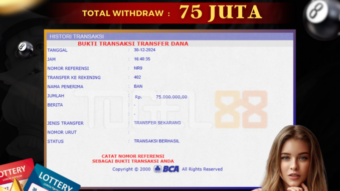 TOGEL88 mengucapkan selamat kepada user id : NOR*** yang telah berhasil mendapatkan jackpot pada permainan TOGEL DI TOTO MACAU 4D. Kemenangan sebesar Rp 75.000.000,-. telah dibayarkan LUNAS oleh pihak TOGEL88 kepada pemilik user id setelah yang bersangkutan mengisi formulir withdraw. Proses pencairan dana berlangsung sangat cepat hanya dalam waktu 5-10 menit sudah berada dalam rekening pemilik user id. Bukti transfer yang dapat anda lihat adalah bukti SAH / VALID yang langsung di dapatkan melalui bukti transaksi dari Bank yang digunakan untuk pengiriman dana pada rekening pemilik user id. Terima kasih kami sampaikan kepada para pengguna setia TOGEL88 yang telah menggunakan situs kami, sebagai Bandar Terpercaya yang pastinya membayar semua kemenangan member hingga lunas. Apakah TOGEL88 PENIPU ? Reputasi “TOGEL88 TERPERCAYA” sudah sangat melekat. puluhan hingga ratusan ribu pengguna setia TOGEL88 tetap menggunakan situs terbesar dan terbaik di Indonesia ini. Hapus rasa was-was dan khawatir anda, kemenangan anda berapapun PASTI dibayarkan hingga lunas.