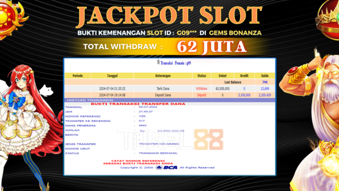 MEMBER TOGEL88 MENERIMA PELUNASAN JACKPOT SLOT di GEMS BONANZA Rp 62.000.000,- LUNAS