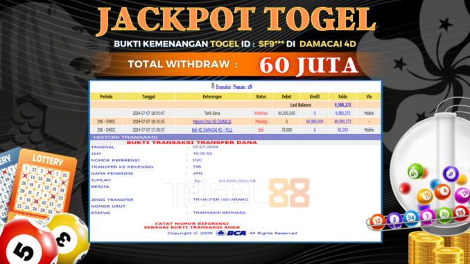 MEMBER TOGEL88 MENERIMA PELUNASAN JACKPOT TOGEL di DAMACAI 4D Rp 60.000.000,- LUNAS