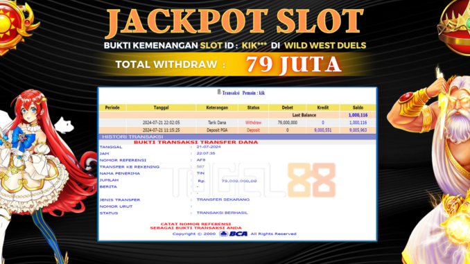 TOGEL88 mengucapkan selamat kepada user id : KIK*** yang telah berhasil mendapatkan jackpot pada permainan SLOT DI WILD WEST DUELS. Kemenangan sebesar Rp 79.000.000,-. telah dibayarkan LUNAS oleh pihak TOGEL88 kepada pemilik user id setelah yang bersangkutan mengisi formulir withdraw. Proses pencairan dana berlangsung sangat cepat hanya dalam waktu 5-10 menit sudah berada dalam rekening pemilik user id. Bukti transfer yang dapat anda lihat adalah bukti SAH / VALID yang langsung di dapatkan melalui bukti transaksi dari Bank yang digunakan untuk pengiriman dana pada rekening pemilik user id. Terima kasih kami sampaikan kepada para pengguna setia TOGEL88 yang telah menggunakan situs kami, sebagai Bandar Terpercaya yang pastinya membayar semua kemenangan member hingga lunas. Apakah TOGEL88 PENIPU ? Reputasi “TOGEL88 TERPERCAYA” sudah sangat melekat. puluhan hingga ratusan ribu pengguna setia TOGEL88 tetap menggunakan situs terbesar dan terbaik di Indonesia ini. Hapus rasa was-was dan khawatir anda, kemenangan anda berapapun PASTI dibayarkan hingga lunas.