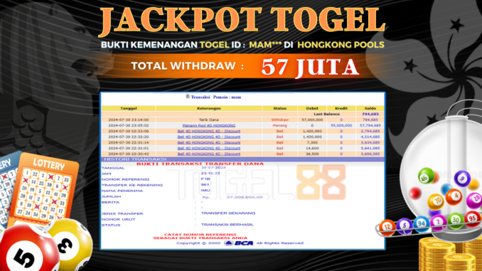 MEMBER TOGEL88 MENERIMA PELUNASAN JACKPOT TOGEL DI HONGKONG POOLS Rp 57.000.000,- LUNAS