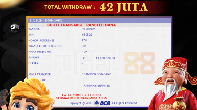 TOGEL88 mengucapkan selamat kepada user id : TOH*** yang telah berhasil mendapatkan jackpot pada permainan SLOT DI STARLIGHT PRINCESS. Kemenangan sebesar Rp 42.000.000,-. telah dibayarkan LUNAS oleh pihak TOGEL88 kepada pemilik user id setelah yang bersangkutan mengisi formulir withdraw. Proses pencairan dana berlangsung sangat cepat hanya dalam waktu 5-10 menit sudah berada dalam rekening pemilik user id. Bukti transfer yang dapat anda lihat adalah bukti SAH / VALID yang langsung di dapatkan melalui bukti transaksi dari Bank yang digunakan untuk pengiriman dana pada rekening pemilik user id. Terima kasih kami sampaikan kepada para pengguna setia TOGEL88 yang telah menggunakan situs kami, sebagai Bandar Terpercaya yang pastinya membayar semua kemenangan member hingga lunas. Apakah TOGEL88 PENIPU ? Reputasi “TOGEL88 TERPERCAYA” sudah sangat melekat. puluhan hingga ratusan ribu pengguna setia TOGEL88 tetap menggunakan situs terbesar dan terbaik di Indonesia ini. Hapus rasa was-was dan khawatir anda, kemenangan anda berapapun PASTI dibayarkan hingga lunas.