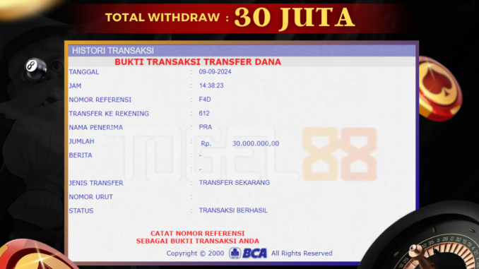 TOGEL88 mengucapkan selamat kepada user id : PRA*** yang telah berhasil mendapatkan jackpot pada permainan LIVE CASINO DI BACCARAT. Kemenangan sebesar Rp 30.000.000,-. telah dibayarkan LUNAS oleh pihak TOGEL88 kepada pemilik user id setelah yang bersangkutan mengisi formulir withdraw. Proses pencairan dana berlangsung sangat cepat hanya dalam waktu 5-10 menit sudah berada dalam rekening pemilik user id. Bukti transfer yang dapat anda lihat adalah bukti SAH / VALID yang langsung di dapatkan melalui bukti transaksi dari Bank yang digunakan untuk pengiriman dana pada rekening pemilik user id. Terima kasih kami sampaikan kepada para pengguna setia TOGEL88 yang telah menggunakan situs kami, sebagai Bandar Terpercaya yang pastinya membayar semua kemenangan member hingga lunas. Apakah TOGEL88 PENIPU ? Reputasi “TOGEL88 TERPERCAYA” sudah sangat melekat. puluhan hingga ratusan ribu pengguna setia TOGEL88 tetap menggunakan situs terbesar dan terbaik di Indonesia ini. Hapus rasa was-was dan khawatir anda, kemenangan anda berapapun PASTI dibayarkan hingga lunas.