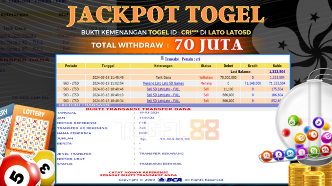 MEMBER TOGEL88 MENERIMA PELUNASAN KEMENANGAN JACKPOT TOGEL DI LATO LATO 5D Rp 70.000.000,- LUNAS