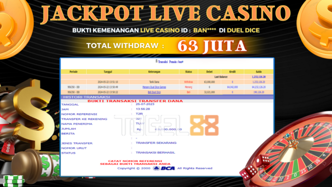 TOGEL88 mengucapkan selamat kepada user id : BAN*** yang telah berhasil mendapatkan jackpot pada permainan LIVE CASINO DI DUEL DICE. Kemenangan sebesar Rp 63.000.000,-. telah dibayarkan LUNAS oleh pihak TOGEL88 kepada pemilik user id setelah yang bersangkutan mengisi formulir withdraw. Proses pencairan dana berlangsung sangat cepat hanya dalam waktu 5-10 menit sudah berada dalam rekening pemilik user id. Bukti transfer yang dapat anda lihat adalah bukti SAH / VALID yang langsung di dapatkan melalui bukti transaksi dari Bank yang digunakan untuk pengiriman dana pada rekening pemilik user id. Terima kasih kami sampaikan kepada para pengguna setia TOGEL88 yang telah menggunakan situs kami, sebagai Bandar Terpercaya yang pastinya membayar semua kemenangan member hingga lunas. Apakah TOGEL88 PENIPU ? Reputasi “TOGEL88 TERPERCAYA” sudah sangat melekat. puluhan hingga ratusan ribu pengguna setia TOGEL88 tetap menggunakan situs terbesar dan terbaik di Indonesia ini. Hapus rasa was-was dan khawatir anda, kemenangan anda berapapun PASTI dibayarkan hingga lunas.