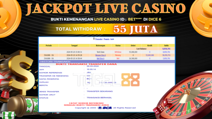 TOGEL88 JACKPOT LIVE CASINO DI DICE 6 Rp 55.000.000,- LUNAS