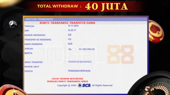 TOGEL88 mengucapkan selamat kepada user id : SUR*** yang telah berhasil mendapatkan jackpot pada permainan LIVE CASINO DI DRAGON TIGER Kemenangan sebesar Rp 40.000.000,-. telah dibayarkan LUNAS oleh pihak TOGEL88 kepada pemilik user id setelah yang bersangkutan mengisi formulir withdraw. Proses pencairan dana berlangsung sangat cepat hanya dalam waktu 5-10 menit sudah berada dalam rekening pemilik user id. Bukti transfer yang dapat anda lihat adalah bukti SAH / VALID yang langsung di dapatkan melalui bukti transaksi dari Bank yang digunakan untuk pengiriman dana pada rekening pemilik user id. Terima kasih kami sampaikan kepada para pengguna setia TOGEL88 yang telah menggunakan situs kami, sebagai Bandar Terpercaya yang pastinya membayar semua kemenangan member hingga lunas. Apakah TOGEL88 PENIPU ? Reputasi “TOGEL88 TERPERCAYA” sudah sangat melekat. puluhan hingga ratusan ribu pengguna setia TOGEL88 tetap menggunakan situs terbesar dan terbaik di Indonesia ini. Hapus rasa was-was dan khawatir anda, kemenangan anda berapapun PASTI dibayarkan hingga lunas.