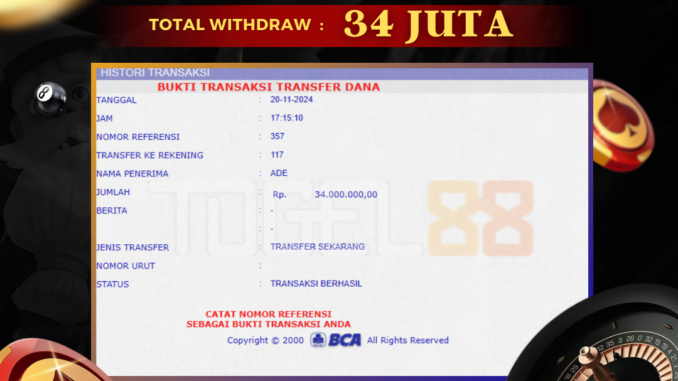 TOGEL88 mengucapkan selamat kepada user id : ADE*** yang telah berhasil mendapatkan jackpot pada permainan LIVE CASINO DI SICBO DICE. Kemenangan sebesar Rp 34.000.000,-. telah dibayarkan LUNAS oleh pihak TOGEL88 kepada pemilik user id setelah yang bersangkutan mengisi formulir withdraw. Proses pencairan dana berlangsung sangat cepat hanya dalam waktu 5-10 menit sudah berada dalam rekening pemilik user id. Bukti transfer yang dapat anda lihat adalah bukti SAH / VALID yang langsung di dapatkan melalui bukti transaksi dari Bank yang digunakan untuk pengiriman dana pada rekening pemilik user id. Terima kasih kami sampaikan kepada para pengguna setia TOGEL88 yang telah menggunakan situs kami, sebagai Bandar Terpercaya yang pastinya membayar semua kemenangan member hingga lunas. Apakah TOGEL88 PENIPU ? Reputasi “TOGEL88 TERPERCAYA” sudah sangat melekat. puluhan hingga ratusan ribu pengguna setia TOGEL88 tetap menggunakan situs terbesar dan terbaik di Indonesia ini. Hapus rasa was-was dan khawatir anda, kemenangan anda berapapun PASTI dibayarkan hingga lunas.