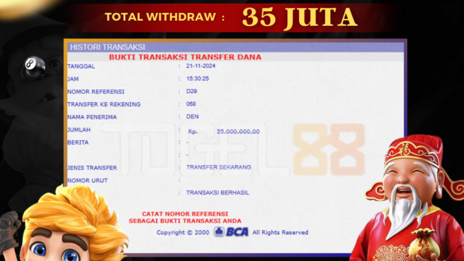 TOGEL88 mengucapkan selamat kepada user id : DEN*** yang telah berhasil mendapatkan jackpot pada permainan SLOT DI GATES OF GATOT KACA. Kemenangan sebesar Rp 35.000.000,-. telah dibayarkan LUNAS oleh pihak TOGEL88 kepada pemilik user id setelah yang bersangkutan mengisi formulir withdraw. Proses pencairan dana berlangsung sangat cepat hanya dalam waktu 5-10 menit sudah berada dalam rekening pemilik user id. Bukti transfer yang dapat anda lihat adalah bukti SAH / VALID yang langsung di dapatkan melalui bukti transaksi dari Bank yang digunakan untuk pengiriman dana pada rekening pemilik user id. Terima kasih kami sampaikan kepada para pengguna setia TOGEL88 yang telah menggunakan situs kami, sebagai Bandar Terpercaya yang pastinya membayar semua kemenangan member hingga lunas. Apakah TOGEL88 PENIPU ? Reputasi “TOGEL88 TERPERCAYA” sudah sangat melekat. puluhan hingga ratusan ribu pengguna setia TOGEL88 tetap menggunakan situs terbesar dan terbaik di Indonesia ini. Hapus rasa was-was dan khawatir anda, kemenangan anda berapapun PASTI dibayarkan hingga lunas.