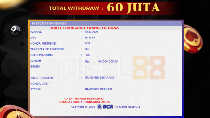 TOGEL88 mengucapkan selamat kepada user id : BRO*** yang telah berhasil mendapatkan jackpot pada permainan LIVE CASINO DI BACCARAT. Kemenangan sebesar Rp 60.000.000,-. telah dibayarkan LUNAS oleh pihak TOGEL88 kepada pemilik user id setelah yang bersangkutan mengisi formulir withdraw. Proses pencairan dana berlangsung sangat cepat hanya dalam waktu 5-10 menit sudah berada dalam rekening pemilik user id. Bukti transfer yang dapat anda lihat adalah bukti SAH / VALID yang langsung di dapatkan melalui bukti transaksi dari Bank yang digunakan untuk pengiriman dana pada rekening pemilik user id. Terima kasih kami sampaikan kepada para pengguna setia TOGEL88 yang telah menggunakan situs kami, sebagai Bandar Terpercaya yang pastinya membayar semua kemenangan member hingga lunas. Apakah TOGEL88 PENIPU ? Reputasi “TOGEL88 TERPERCAYA” sudah sangat melekat. puluhan hingga ratusan ribu pengguna setia TOGEL88 tetap menggunakan situs terbesar dan terbaik di Indonesia ini. Hapus rasa was-was dan khawatir anda, kemenangan anda berapapun PASTI dibayarkan hingga lunas.