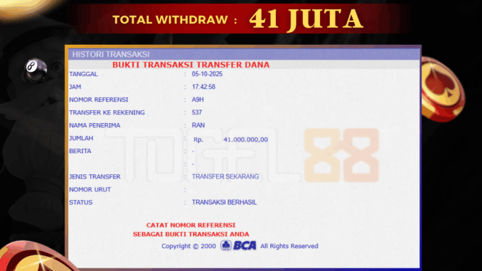 TOGEL88 mengucapkan selamat kepada user id : RAN*** yang telah berhasil mendapatkan jackpot pada permainan LIVE CASINO DI 24D SPIN. Kemenangan sebesar Rp 41.000.000,-. telah dibayarkan LUNAS oleh pihak TOGEL88 kepada pemilik user id setelah yang bersangkutan mengisi formulir withdraw. Proses pencairan dana berlangsung sangat cepat hanya dalam waktu 5-10 menit sudah berada dalam rekening pemilik user id. Bukti transfer yang dapat anda lihat adalah bukti SAH / VALID yang langsung di dapatkan melalui bukti transaksi dari Bank yang digunakan untuk pengiriman dana pada rekening pemilik user id. Terima kasih kami sampaikan kepada para pengguna setia TOGEL88 yang telah menggunakan situs kami, sebagai Bandar Terpercaya yang pastinya membayar semua kemenangan member hingga lunas. Apakah TOGEL88 PENIPU ? Reputasi “TOGEL88 TERPERCAYA” sudah sangat melekat. puluhan hingga ratusan ribu pengguna setia TOGEL88 tetap menggunakan situs terbesar dan terbaik di Indonesia ini. Hapus rasa was-was dan khawatir anda, kemenangan anda berapapun PASTI dibayarkan hingga lunas.