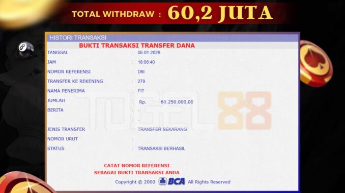 TOGEL88 mengucapkan selamat kepada user id : BAS*** yang telah berhasil mendapatkan jackpot pada permainan LIVE CASINO DI BACCARAT. Kemenangan sebesar Rp 60.250.000,-. telah dibayarkan LUNAS oleh pihak TOGEL88 kepada pemilik user id setelah yang bersangkutan mengisi formulir withdraw. Proses pencairan dana berlangsung sangat cepat hanya dalam waktu 5-10 menit sudah berada dalam rekening pemilik user id. Bukti transfer yang dapat anda lihat adalah bukti SAH / VALID yang langsung di dapatkan melalui bukti transaksi dari Bank yang digunakan untuk pengiriman dana pada rekening pemilik user id. Terima kasih kami sampaikan kepada para pengguna setia TOGEL88 yang telah menggunakan situs kami, sebagai Bandar Terpercaya yang pastinya membayar semua kemenangan member hingga lunas. Apakah TOGEL88 PENIPU ? Reputasi “TOGEL88 TERPERCAYA” sudah sangat melekat. puluhan hingga ratusan ribu pengguna setia TOGEL88 tetap menggunakan situs terbesar dan terbaik di Indonesia ini. Hapus rasa was-was dan khawatir anda, kemenangan anda berapapun PASTI dibayarkan hingga lunas.