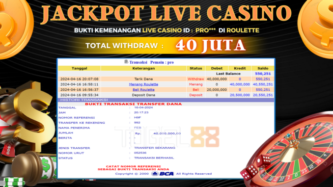 TOGEL88 JACKPOT LIVE CASINO DI ROULETTE Rp 40.000.000,- LUNAS