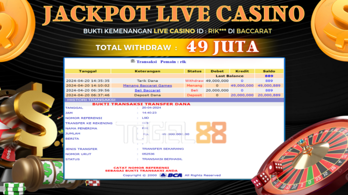 TOGEL88 JACKPOT LIVE CASINO DI BACCARAT Rp 49.000.000,- LUNAS