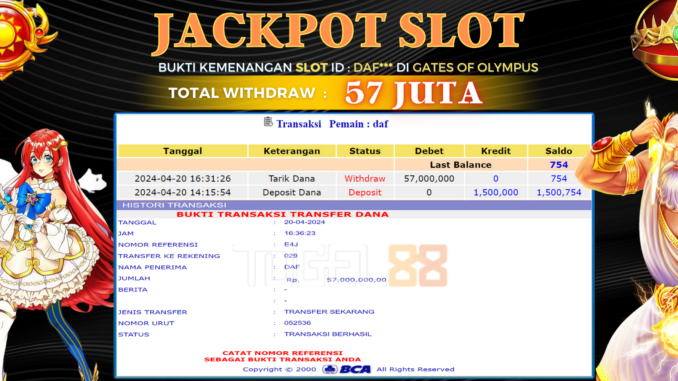 TOGEL88 mengucapkan selamat kepada user id : DAF*** yang telah berhasil mendapatkan jackpot pada permainan SLOT DI GATES OF OLYMPUS. Kemenangan sebesar Rp 57.000.000,-. telah dibayarkan LUNAS oleh pihak TOGEL88 kepada pemilik user id setelah yang bersangkutan mengisi formulir withdraw. Proses pencairan dana berlangsung sangat cepat hanya dalam waktu 5-10 menit sudah berada dalam rekening pemilik user id. Bukti transfer yang dapat anda lihat adalah bukti SAH / VALID yang langsung di dapatkan melalui bukti transaksi dari Bank yang digunakan untuk pengiriman dana pada rekening pemilik user id. Terima kasih kami sampaikan kepada para pengguna setia TOGEL88 yang telah menggunakan situs kami, sebagai Bandar Terpercaya yang pastinya membayar semua kemenangan member hingga lunas. Apakah TOGEL88 PENIPU ? Reputasi “TOGEL88 TERPERCAYA” sudah sangat melekat. puluhan hingga ratusan ribu pengguna setia TOGEL88 tetap menggunakan situs terbesar dan terbaik di Indonesia ini. Hapus rasa was-was dan khawatir anda, kemenangan anda berapapun PASTI dibayarkan hingga lunas.