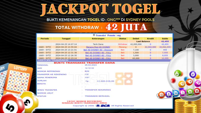 TOGEL88 mengucapkan selamat kepada user id : ONG*** yang telah berhasil mendapatkan jackpot pada permainan TOGEL DI SYDNEY POOLS. Kemenangan sebesar Rp 42.000.000,-. telah dibayarkan LUNAS oleh pihak TOGEL88 kepada pemilik user id setelah yang bersangkutan mengisi formulir withdraw. Proses pencairan dana berlangsung sangat cepat hanya dalam waktu 5-10 menit sudah berada dalam rekening pemilik user id. Bukti transfer yang dapat anda lihat adalah bukti SAH / VALID yang langsung di dapatkan melalui bukti transaksi dari Bank yang digunakan untuk pengiriman dana pada rekening pemilik user id. Terima kasih kami sampaikan kepada para pengguna setia TOGEL88 yang telah menggunakan situs kami, sebagai Bandar Terpercaya yang pastinya membayar semua kemenangan member hingga lunas. Apakah TOGEL88 PENIPU ? Reputasi “TOGEL88 TERPERCAYA” sudah sangat melekat. puluhan hingga ratusan ribu pengguna setia TOGEL88 tetap menggunakan situs terbesar dan terbaik di Indonesia ini. Hapus rasa was-was dan khawatir anda, kemenangan anda berapapun PASTI dibayarkan hingga lunas.
