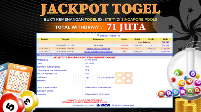 TOGEL88 JACKPOT TOGEL DI SINGAPORE POOLS Rp 71.000.000,- LUNAS