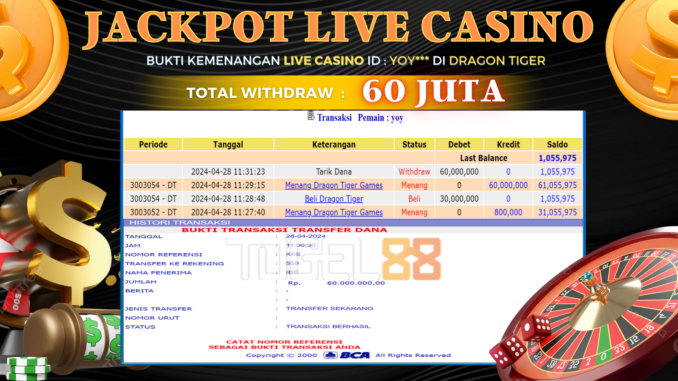 TOGEL88 JACKPOT LIVE CASINO DI DRAGON TIGER Rp 60.000.000,- LUNAS