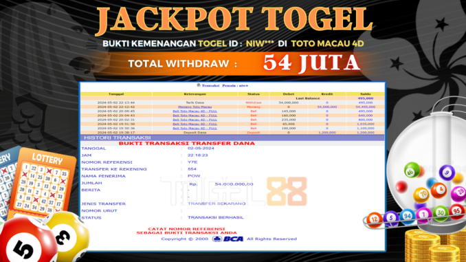 TOGEL88 JACKPOT TOGEL di TOTO MACAU 4D Rp 54.000.000,- LUNAS