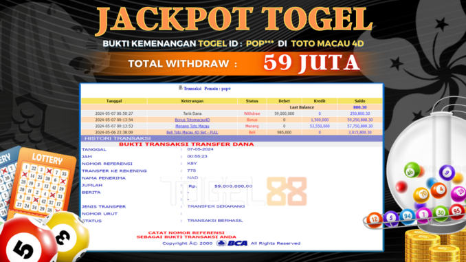 TOGEL88 JACKPOT TOGEL DI TOTO MACAU 4D Rp 59.000.000,- LUNAS