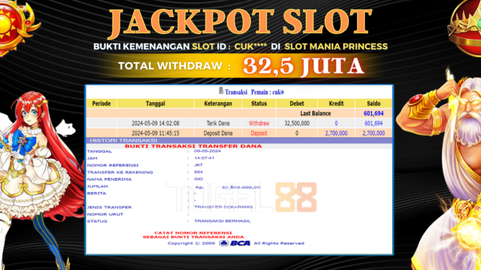 TOGEL88 JACKPOT SLOT DI SLOT MANIA PRINCESS 1000 Rp 32.500.000,- LUNAS