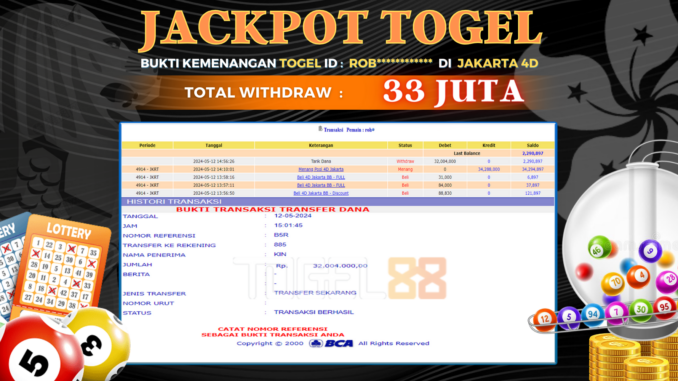 MEMBER TOGEL88 MENERIMA PELUNASAN KEMENANGAN JACKPOT TOGEL DI JAKARTA 4D Rp 33.000.000,- LUNAS
