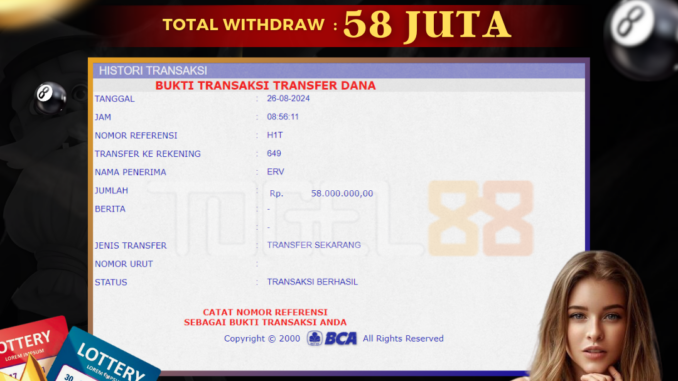 TOGEL88 mengucapkan selamat kepada user id : AGU*** yang telah berhasil mendapatkan jackpot pada permainan TOGEL DI 3D ECUADOR. Kemenangan sebesar Rp 54.000.000,-. telah dibayarkan LUNAS oleh pihak TOGEL88 kepada pemilik user id setelah yang bersangkutan mengisi formulir withdraw. Proses pencairan dana berlangsung sangat cepat hanya dalam waktu 5-10 menit sudah berada dalam rekening pemilik user id. Bukti transfer yang dapat anda lihat adalah bukti SAH / VALID yang langsung di dapatkan melalui bukti transaksi dari Bank yang digunakan untuk pengiriman dana pada rekening pemilik user id. Terima kasih kami sampaikan kepada para pengguna setia TOGEL88 yang telah menggunakan situs kami, sebagai Bandar Terpercaya yang pastinya membayar semua kemenangan member hingga lunas. Apakah TOGEL88 PENIPU ? Reputasi “TOGEL88 TERPERCAYA” sudah sangat melekat. puluhan hingga ratusan ribu pengguna setia TOGEL88 tetap menggunakan situs terbesar dan terbaik di Indonesia ini. Hapus rasa was-was dan khawatir anda, kemenangan anda berapapun PASTI dibayarkan hingga lunas.